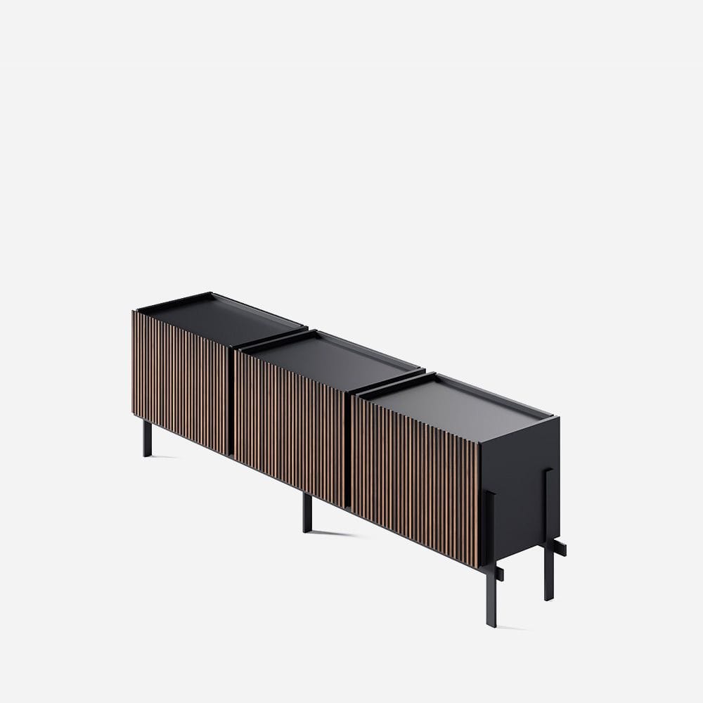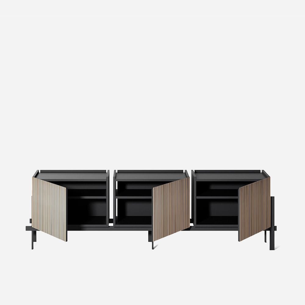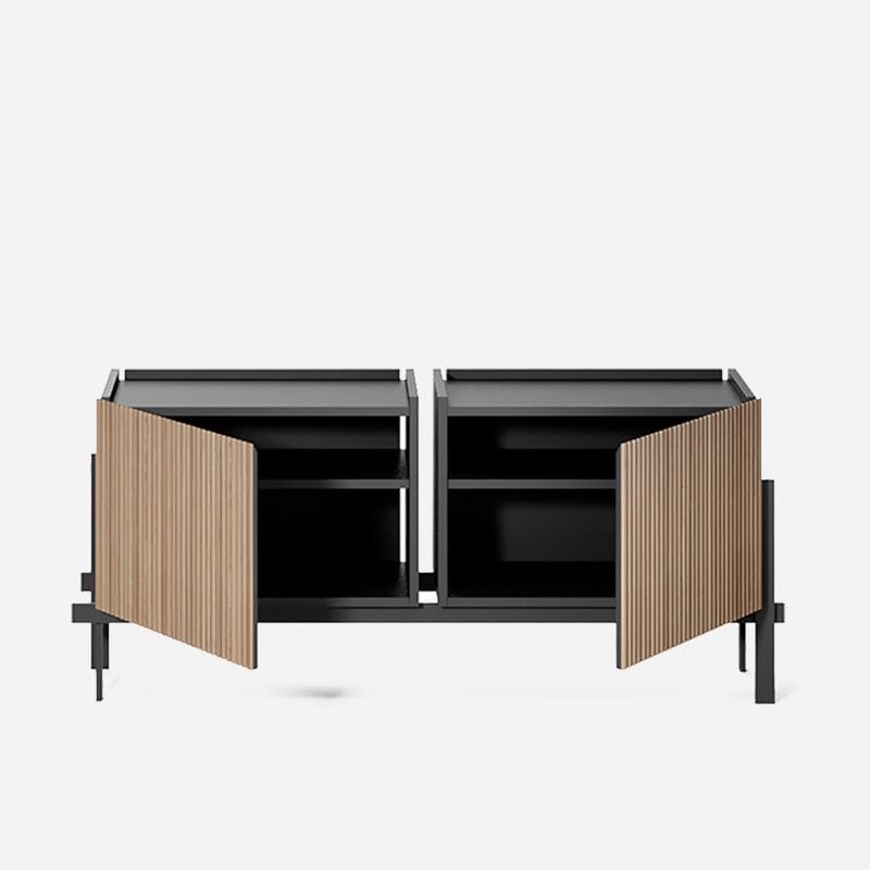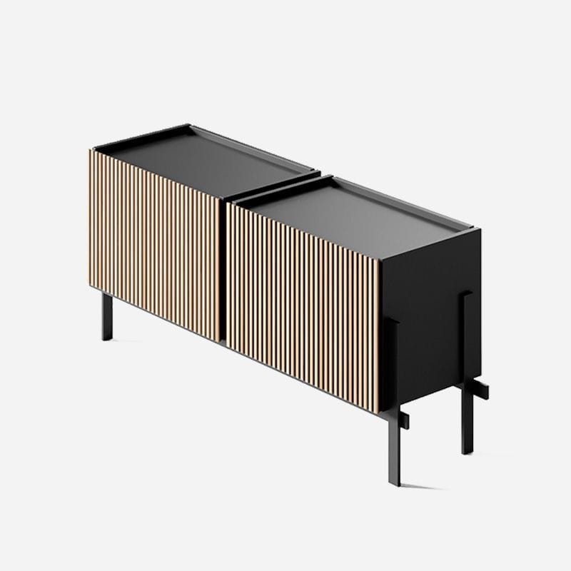 Denne skjenken har struktur med modern overflatene og svarte ben som skaper et moderne og minimalistisk preg med rette linjer.