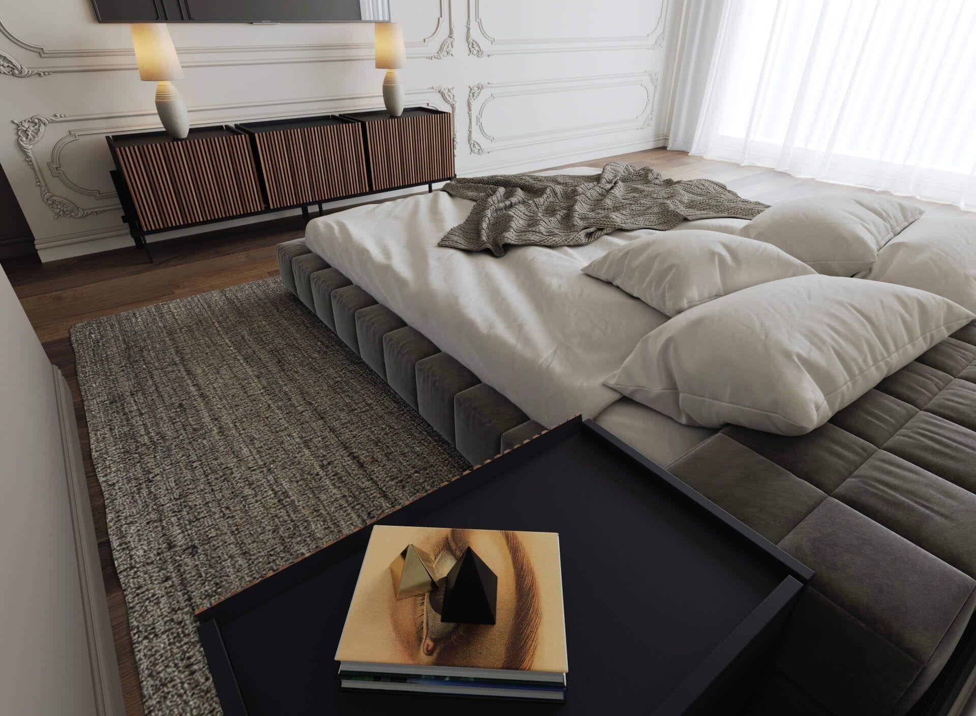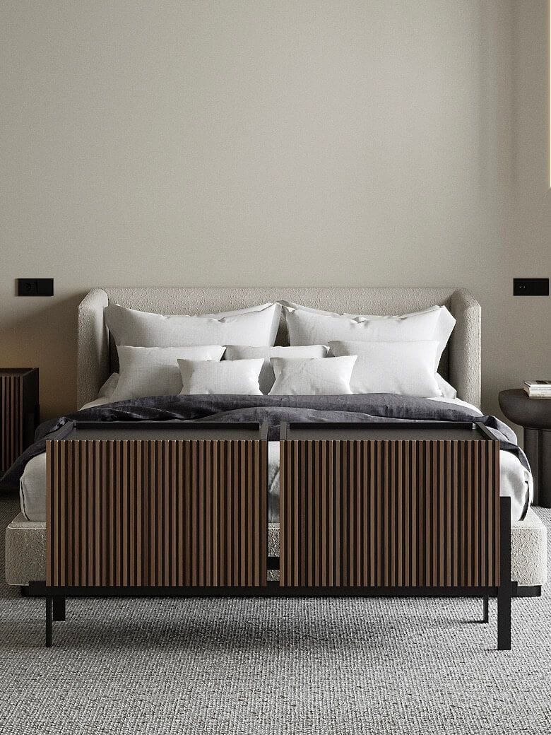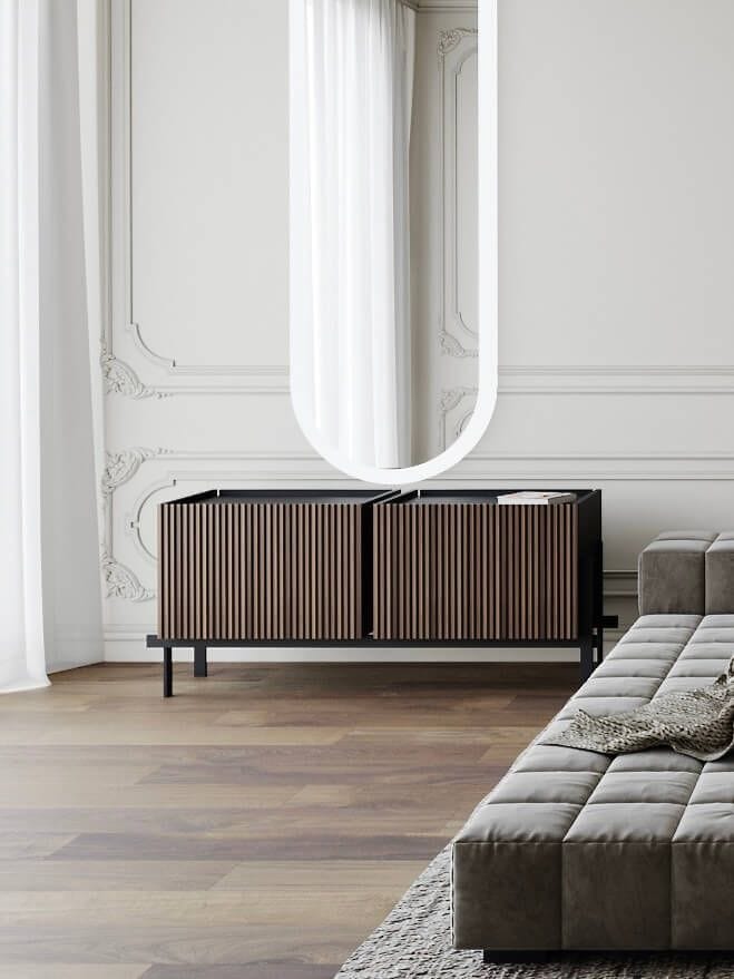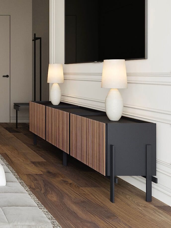 Denne skjenken har struktur med modern overflatene og svarte ben som skaper et moderne og minimalistisk preg med rette linjer.