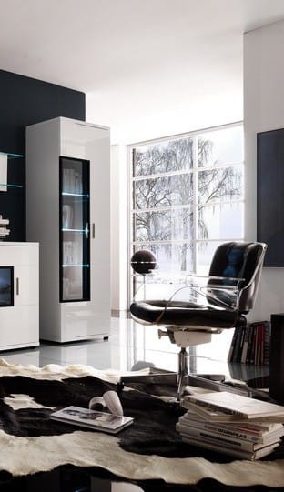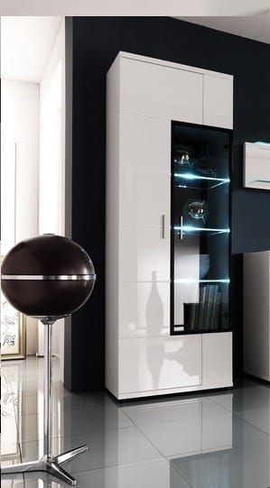 Vitrinskåpet Omega har en smal och modern design med rena, raka linjer.